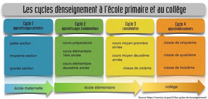 De la maternelle jusqu’au collège, l’apprentissage est divisé en différents cycles qui structurent le parcours scolaire de l’élève :