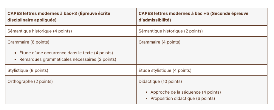Et surtout attention les perfectionnistes, il va falloir se forcer à être stratégique : rien ne sert de s’acharner à fournir une masse d’analyses au premier exercice de sémantique historique qui vaut 2 points (au CAPES +5) puis de devoir bâcler par manque de temps le dernier exercice de didactique qui en vaut 10.